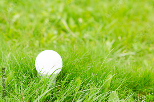 energy saving light bulb on green grass background. soft focus. copy space, place for text.