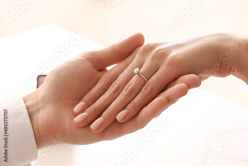 Engaged couple holding hands at table, closeup