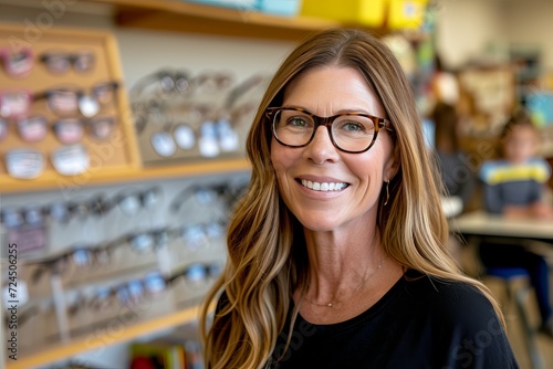 Engaged female teacher smiling at camera with students learning in elementary school classroom