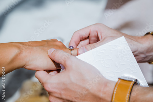 Engagement ring for romantic outdoor elopement marriage proposal when man proposing and holding up an engagement ring in box