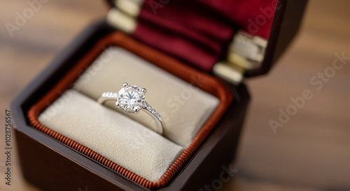 engagement ring with large white diamond and small diamonds on the shank in a beautiful dark box, close-up