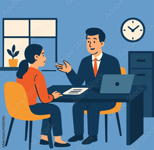 Engaging Business Meeting: A Flat Vector Illustration Depicting a Professional Dialogue Between a Man and a Woman in a Modern Office Setting