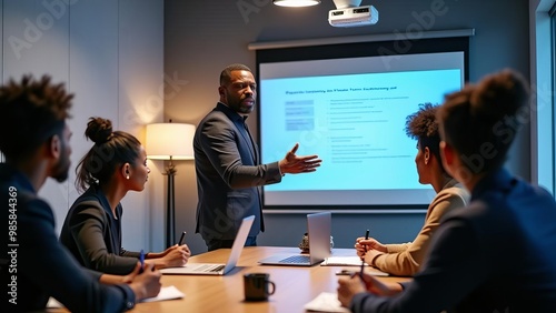 Engaging Business Presentation: Diverse Team Meeting with Animated Speaker in Modern Conference Room
