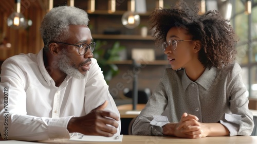 Engaging conversation between two Black professionals in modern office setting, dressed in smart casual attire, discussing work ideas.