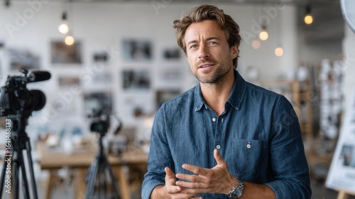 Engaging Male Speaker with Camera in Modern Studio Environment