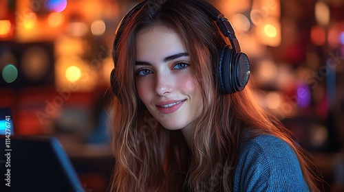 Engaging podcast session with a woman using a microphone laptop and headphones in a modern stylish workspace