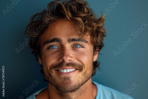 Engaging portrait of a man with a bright smile and captivating blue eyes, giving off an approachable vibe