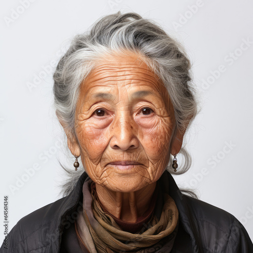 Engaging studio head shot of a captivating 93-year-old woman from Central Asia.
