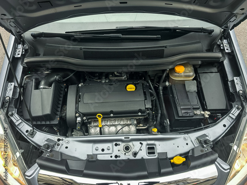 Engine components showcased from a variety of angles under open hood revealing intricate mechanics and precision engineering in a car parked in a driveway