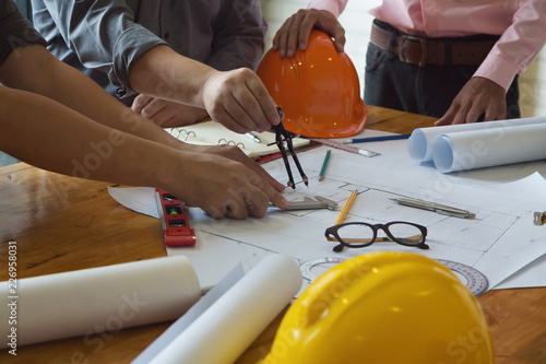 Engineer and Architect concept, Engineer Architects and real estate agent office team working with blueprints