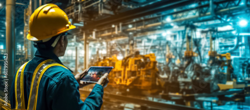 Engineer check and control welding robotics automatic arms machine in factory automotive industrial with digital tablet. blurred digital manufacturing operation. digital ai. Industry 4.0