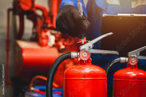 Engineer check fire extinguisher tank in the fire control room for safety in factory or industry.