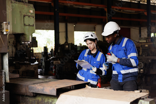 Engineer checking machine maintenance service with team working together teamwork in steel heavy factory