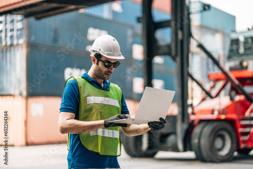 Engineer dock worker in protective safety jumpsuit uniform and with hardhat and use laptop computer at cargo container shipping warehouse. transportation import,export logistic industrial