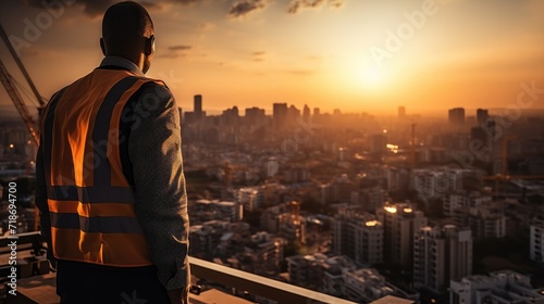 Engineer holding tablet on rooftop for communication, construction or outdoor networking