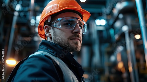 Engineer in a hard hat and safety glasses, working on maintenance tasks at a petrochemical power plant, with industrial machinery in view