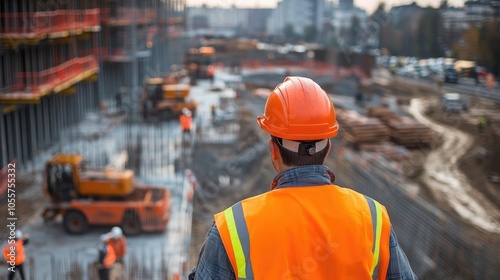 Engineer in an orange hard hat focuses on construction tasks at a worksite