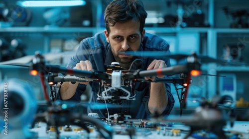 Engineer in drone repair facility, fixing damaged drone parts, high-tech lab with diagnostic equipment
