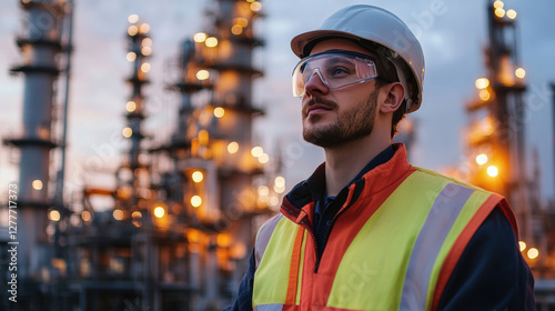 Engineer in safety gear observing industrial refinery with lit structures at dusk