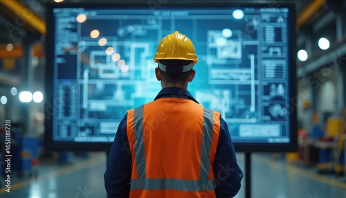 Engineer in safety gear studies industrial project plan on digital screen in factory. Focus on technology, management, manufacturing workflow, automation, precision. Modern facility operation with