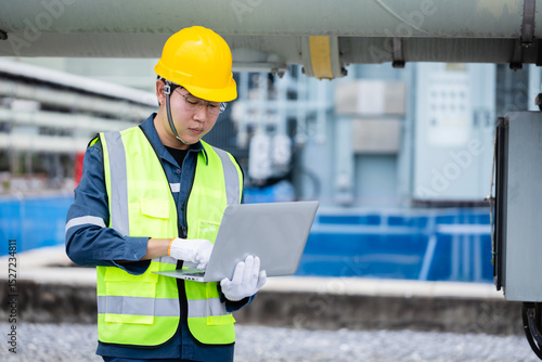 Engineer is working at high voltage power substation conducting inspection and check of infrastructure using laptop to ensure safety and efficiency