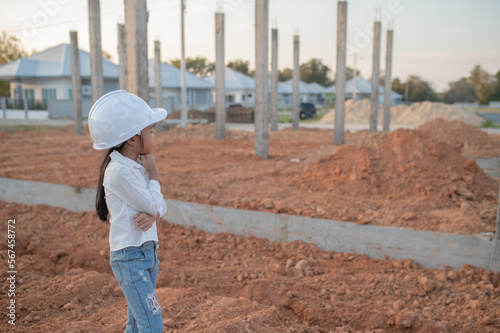 Engineer kid concept,Asian little girl wear engineer uniform working at site of building