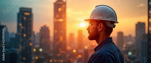 Engineer looks out over cityscape at sunset. Urban progress symbolized by double exposure effect of city lights, sunset. Modern architecture, infrastructure evident in background. Pro outlook, vision