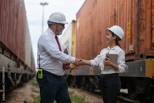Engineer manager and a secretary working together railway track during inspection or routine maintenance container industrial or transportation setting the rail train import export logistics.