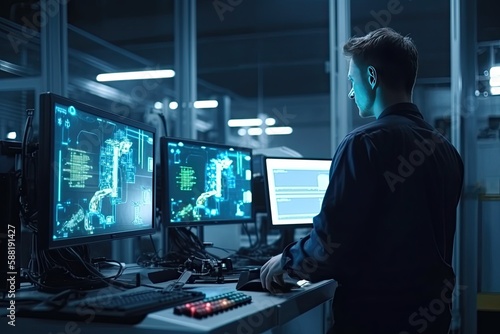 Engineer manager monitors and controls robot arm automation in smart factories in real time monitoring system software, welding robots and digital manufacturing operations