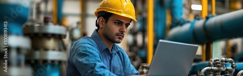 Engineer Monitoring Factory Equipment with Laptop, Industrial Setting