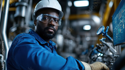 Engineer monitoring pressure in oil refinery, focused and professional