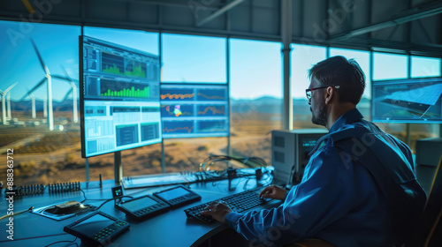 Engineer Monitoring Renewable Energy Production on Multiple Screens in a Modern Control Room with Wind Turbines in the Background