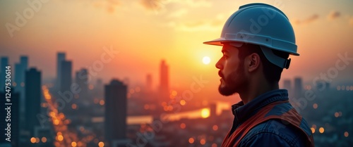 Engineer observes city skyline during sunset. Profile view with double exposure effect. Urban progress symbolized by cityscape, worker. Modern pro in helmet. City lights bokeh in twilight. Great for