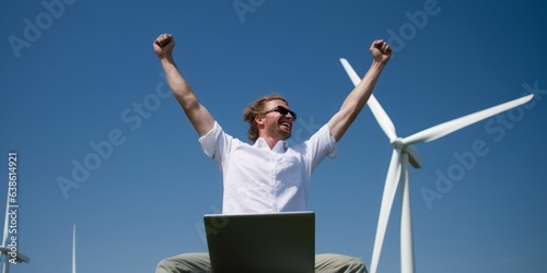 Engineer on Wind Turbine: Expert in Uniform with Laptop Sits on Wind Turbine, Harnessing Wind Energy Amidst Sun-Kissed Summer Landscape, Embracing Future Tech and Sustainable Energy