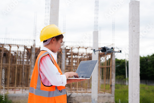 Engineer operating drone at construction site for industrial inspection and surveillance, ensuring safety, power infrastructure development, and environmental monitoring with advanced remote control t