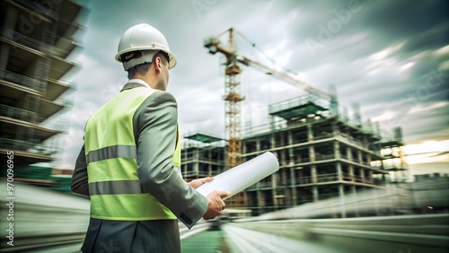 Engineer overseeing construction site with plans in hand, wearing a hard hat and safety vest, with cranes and buildings in the background.