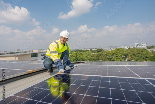 Engineer service check installation solar cell on the roof of factory. Silhouette technician inspection and repair solar cell on the roof of factory. Technology solar energy renewable.