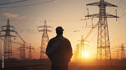Engineer stands and looks at a large group of high-voltage electric poles.