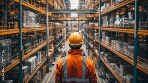 Engineer supervisor stands contemplatively with a hard hat, overseeing the busy operations of a bustling industrial facility.