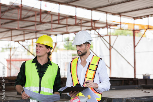 Engineer, Teamwork, Construction site. Team of male engineer construction working and inspecting structure of building at construction site. Construction builder control of work at site work