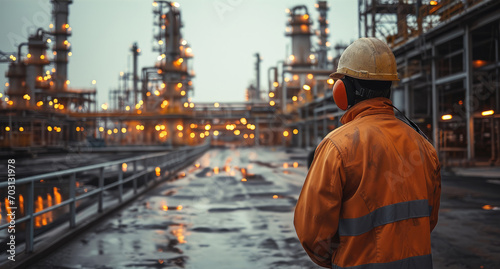 Engineer Technician Watching Team of Workers on High Steel Platform. Generative AI.
