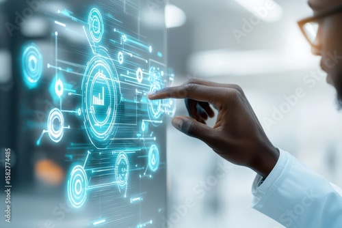 Engineer warehouse shipping concept. Innovative hand interacting with digital technology interface displaying data visualizations.