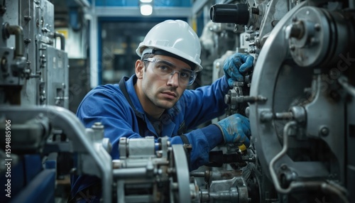 Engineer wearing hard hat, safety glasses performs maintenance on industrial machinery in factory setting. Technician works with complex equipment, focusing on precise repair tasks. Blue collar