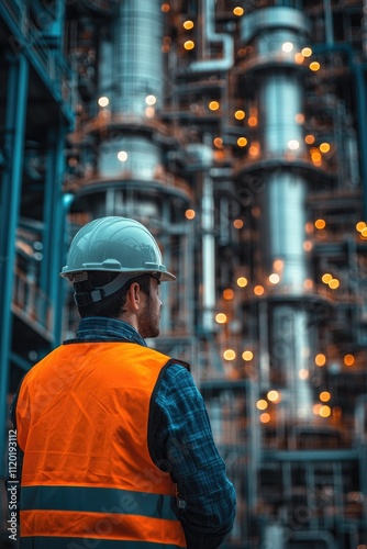 Engineer wearing hardhat and safety vest inspecting industrial plant