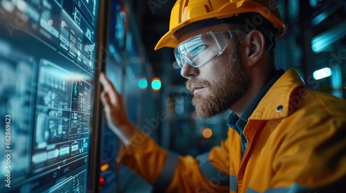 Engineer wearing safety helmet and glasses working on a futuristic control panel in a high-tech industrial environment.