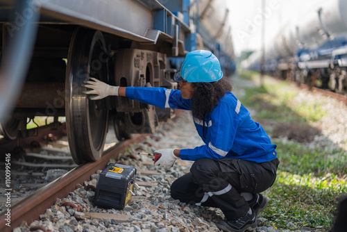 Engineer wearing safety uniform sitting on railway inspection. construction worker on railways. Engineer working on Railway. Rail, engineer, Infrastructure.