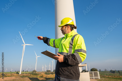 Engineer wearing uniform inspection and survey work in wind turbine farms rotation to generate electricity energy. Maintenance engineer working in wind turbine farm at sunset.