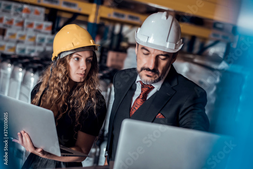 Engineer woman and businessman wearing a hardhat standing cargo at goods warehouse and check for control loading from Cargo freight ship for import and export by report on laptop. Teamwork concept