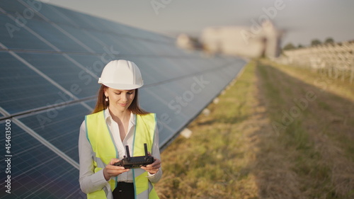Engineer woman in hardhat holding tablet computer operating flying drone in solar plant. Photovoltaic solar panel installation. Solar array. New technologies. The investor checks the solar power