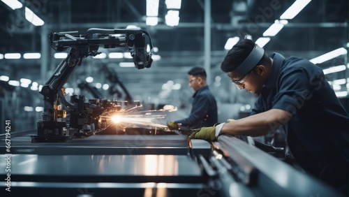 Engineer worker in automotive factory, car manufacturing process, assembly line production, technici